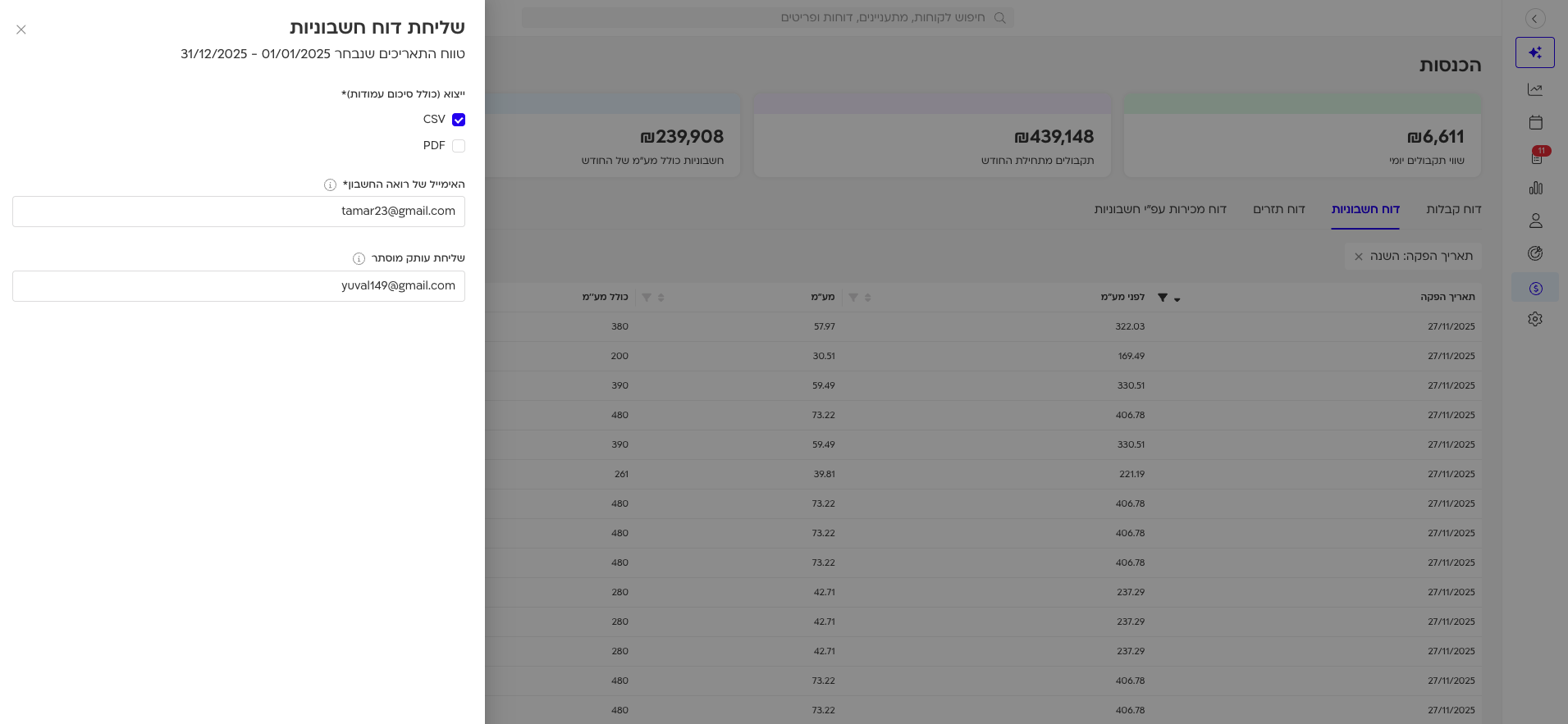 בואו נעשה את קצר חברות וחברים - הגיעה סוף השנה ורואה החשבון שלכם חם על הדוחות שנתיים? מצוין, אתם יכולים לשתף אותם בקלות דרך המערכת! פשוט היכנסו למסך ה-״ההכנסות״, ועברו ללשונית ״דוח חשבוניות״. כעת, סננו את טווח התאריכים בהתאם (31.12.25 - 01.01.25), לחצו על כפתור ה-״פעולות״ (מופיע בחלקו השמאלי עליון של המסך), ולסיום בחרו ב-״שליחת דוח לרואה חשבון״.